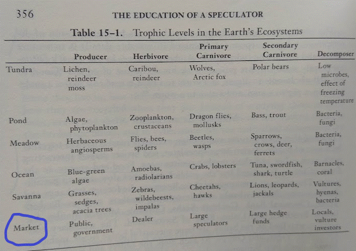 You need to establish if you are likely to be the predator or the prey. Victor Niederhoffer has a beautiful chapter in The Education Of A Speculator called The Ecology Of The Markets. It’s a perfect summary of how the markets work, and it pays to know where you are in the food chain.