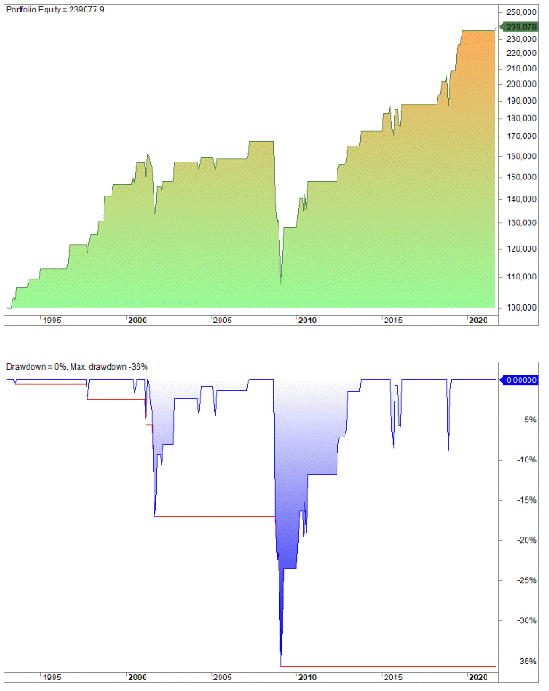 The chart below shows both the equity curve and the drawdown expressed in percent. For example, in early 2020 the strategy made a new top in the equity curve, but the Covid-19 reduced your equity from 116 000 to under 98 000. The difference between those two numbers is the drawdown. You can express the drawdown in both absolute numbers and in percentages. We prefer the latter.