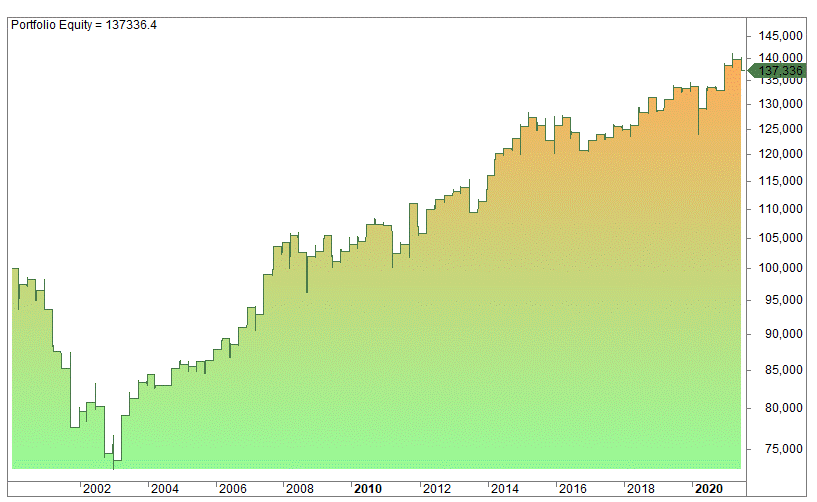 100 000 is invested in March 2000 and reinvested into the next quarterly futures expiration week. Thus, there are four trades a year. There are no commissions or slippage.