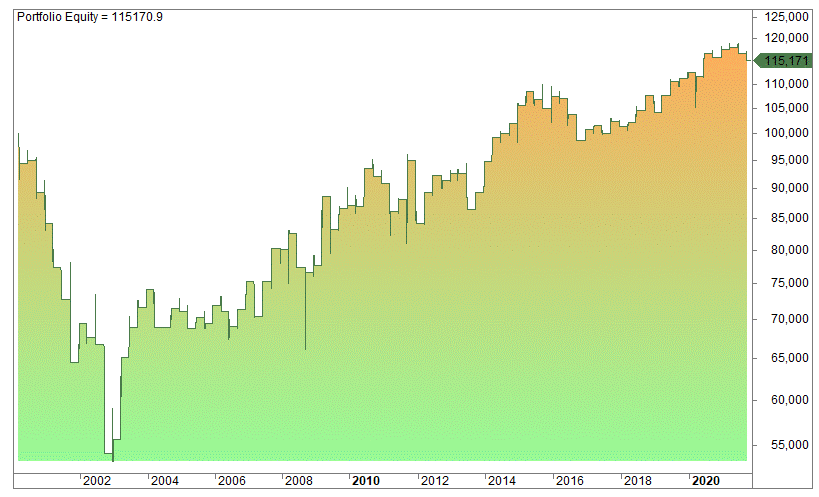 100 000 is invested in March 2000 and reinvested into the next quarterly futures expiration week. Thus, there are four trades a year. There are no commissions or slippage.