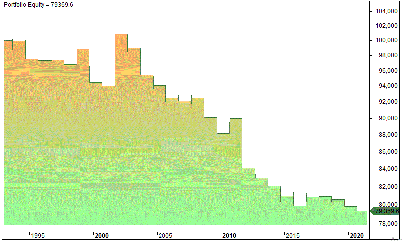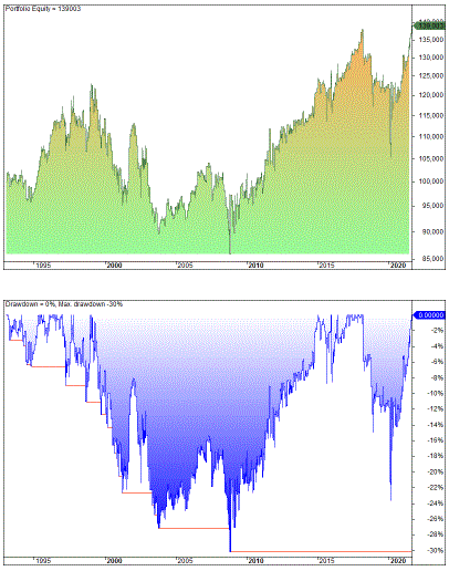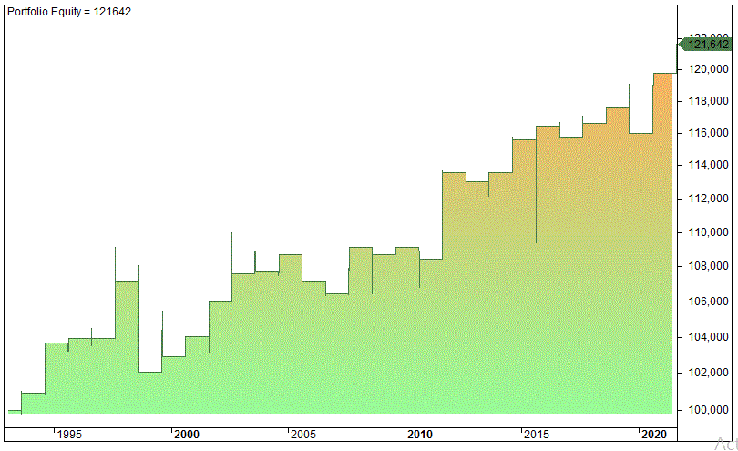 If we invested 100 000 in 1993 and let this amount compound until September 2021 (while only being invested during the week after options expiration week), we get this equity curve:
