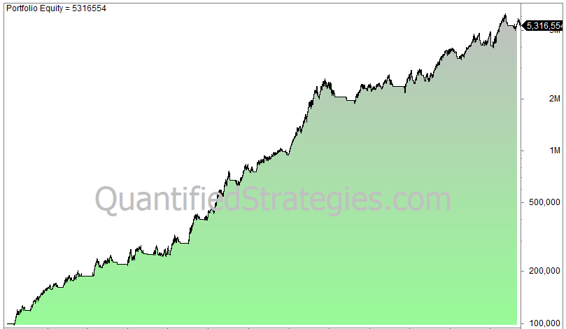 100 000 invested in 1960 is worth 4.7 million today, compounded but not including dividends because we backtested the cash index. The biggest drawdown happened during the crash in October 1987 with 26%. The strategy has a CAGR of 6.3% which is slightly lower than the buy & hold at 7%.