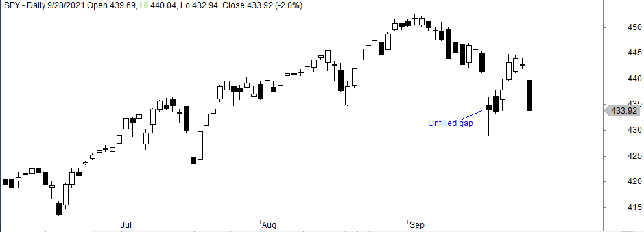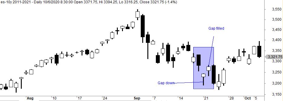 If the gap is not filled during the first day we label it as unfilled. For example, if the S&P 500 opens below yesterday’s low and never trade above yesterday’s low, it’s an unfilled gap. Here is an example in the S&P 500: