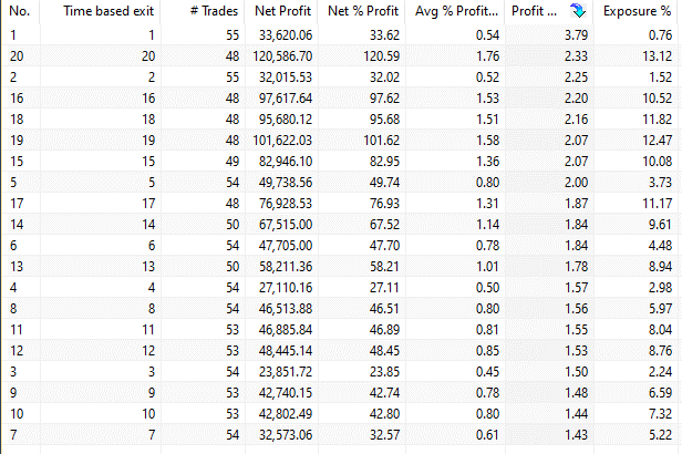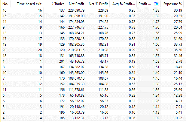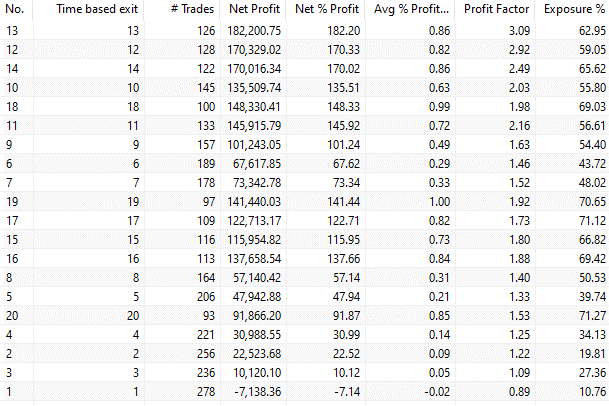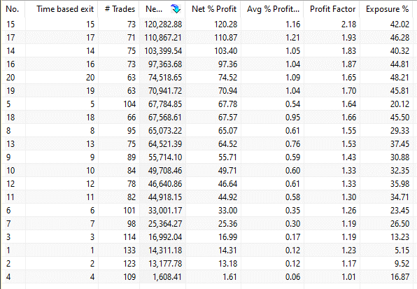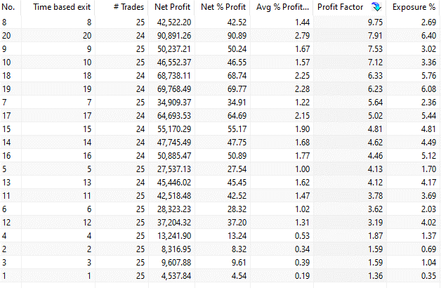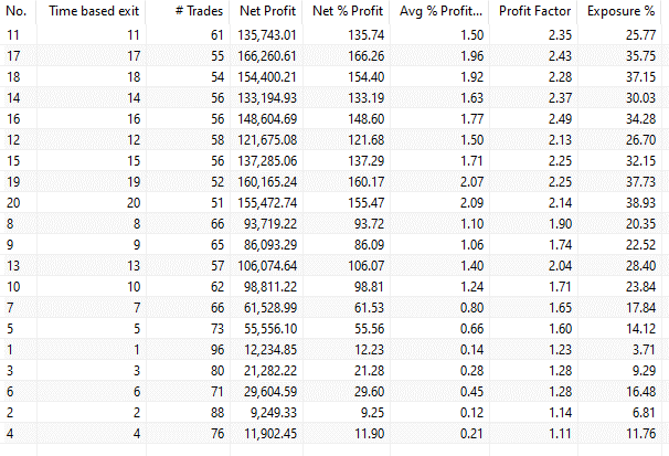 This has returned the following results with a holding period from 1 to 20 days (column 2 showing the result with an exit after x days):