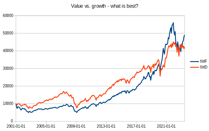The two ETFs followed each other until 2018, but since then, growth has outperformed value. It was especially after the Covid that growth fired on all cylinders.