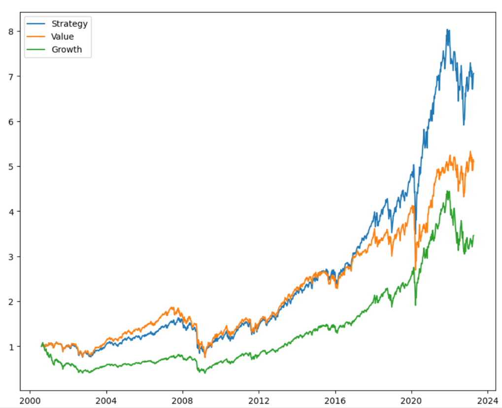 Below, we are going to define what value and growth is, identify when each one performs better, and develop and backtest a trading strategy.