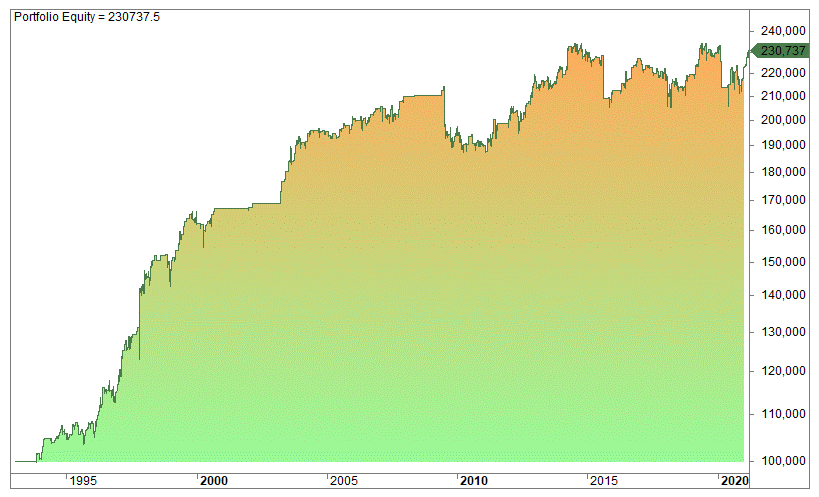 Which strategy can you use for volatility play? Below we share one example, (more strategies coming later in this article) even though we don’t reveal the code. We have plenty of free strategies on the website, and short strategies are hard to come by, at least in the stock market, and thus we want to save it for our paying customers. Below we have an equity chart that only takes trades when the close yesterday was below its 200-day average (plus two additional criteria):