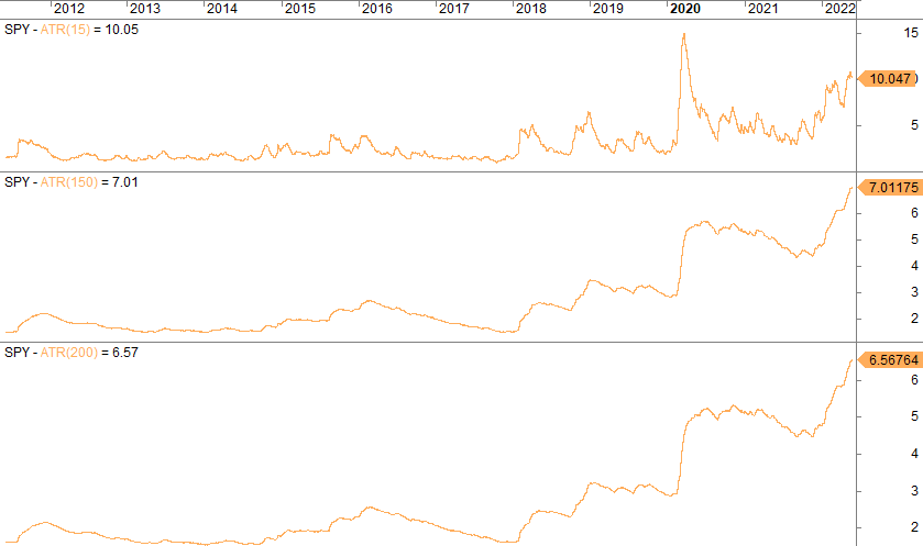 Another indicator that is based on volatility is the ATR indicator. The indicator is based on three different calculations, and it expands as volatility picks up. Risk management frequently involves adjusting for volatility, and ATR is very often used for volatility position sizing.
