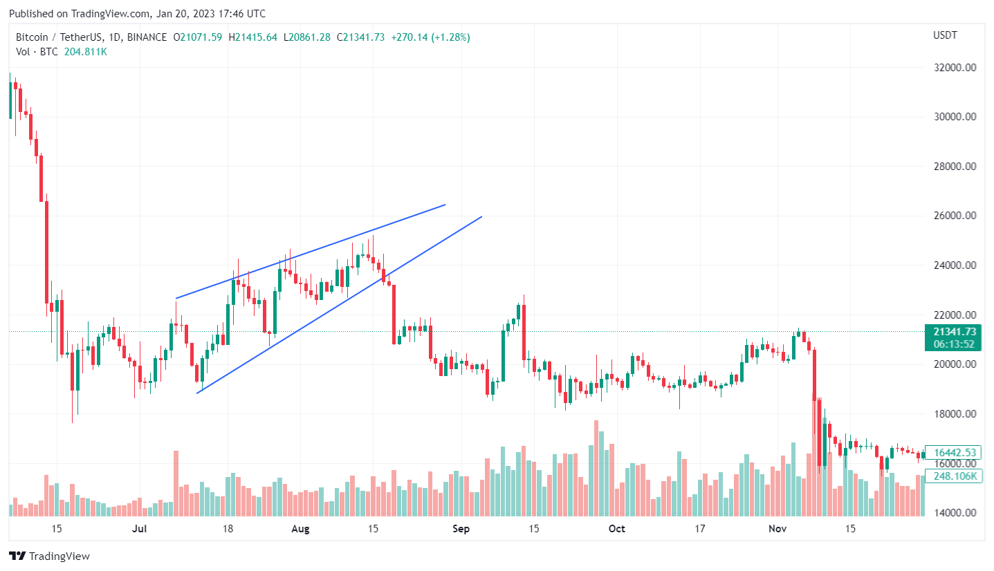 The pattern has the shape of a wedge, with a broad base and a converging apex. In a rising wedge, the swing highs are muted, while the swing lows show a sharp slope.