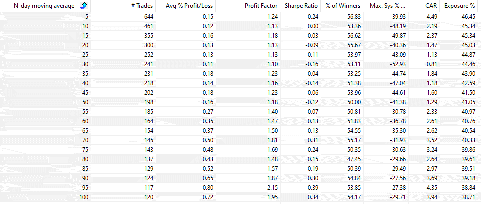 The fourth column, which contains the profit factor, shows that this strategy is pretty poor, except for the longest averages. The longest averages are good because we get to ride the long-term positive upward trend in stocks.