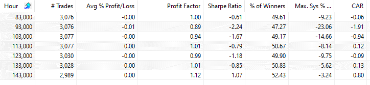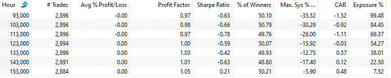 In test no. 1 we buy at the open every hour and sell at the close of the trading day. The close is defined as the close of the “regular” trading hours local time.