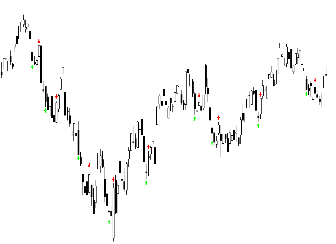 The green arrows indicate when we buy, and the red arrows when we sell. As you can see, the red arrows are when the close is higher than the High of yesterday.