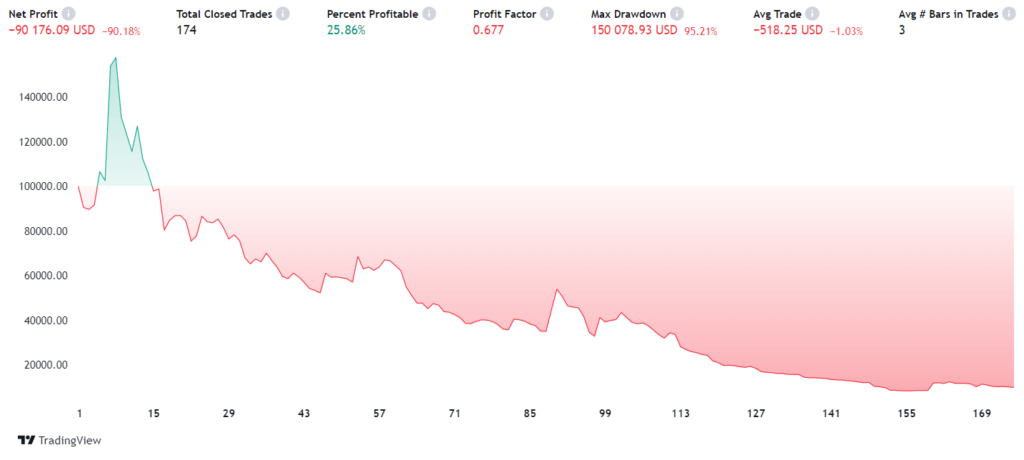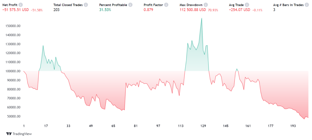 However, we need to remember that there are always tradeoffs in trading. The price we pay for these higher returns over a shorter timespan is a degree of uncertainty unsuitable for long-term trading. The Profit Factor is low – too low for our liking. The Max Drawdown is also alarmingly high, at -42.6%. Moreover, the strategy has been in a drawdown since October 2020.
