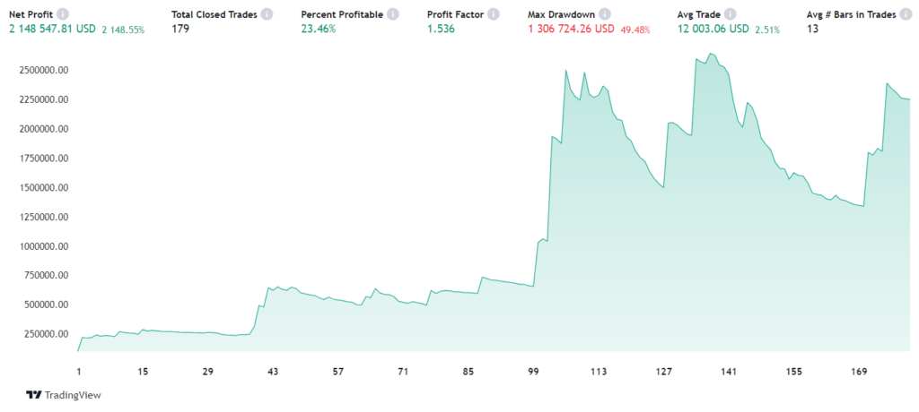 Backtesting on BTC for this period with the Price Action Momentum Strategy yields the following results: