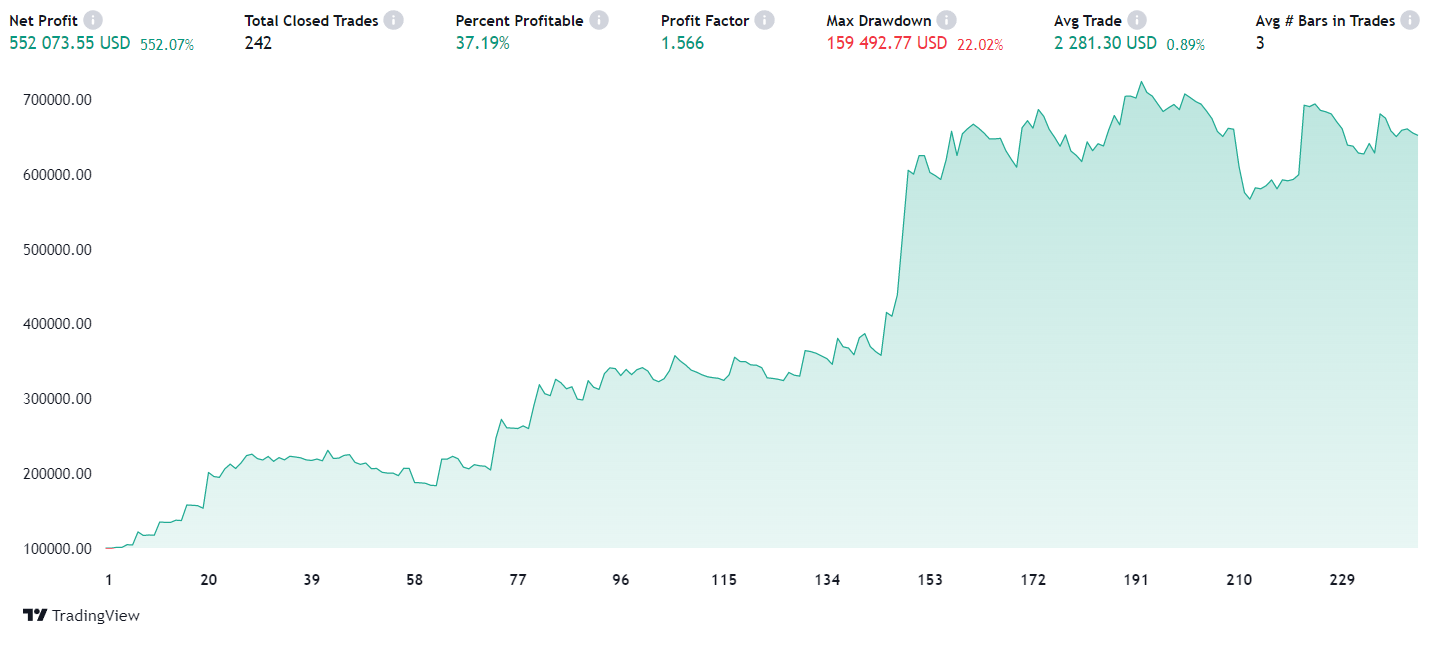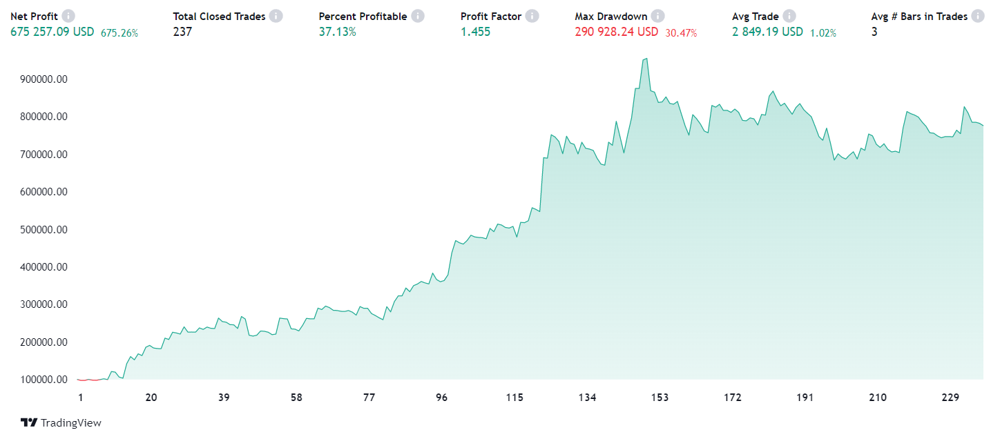 Backtesting on BTC for this period with the Price Action Momentum Strategy yields the following results:
