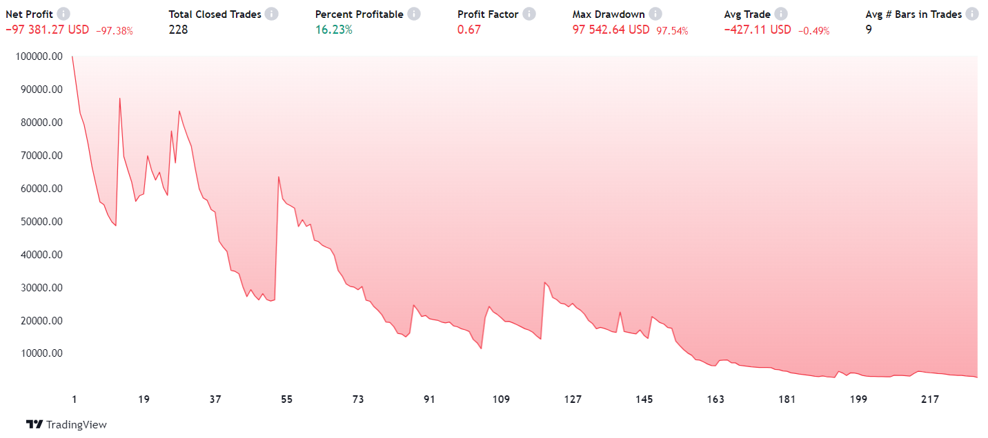 However, we need to remember that there are always tradeoffs in trading. The price we pay for these higher returns over a shorter timespan is a degree of uncertainty unsuitable for long-term trading. The Profit Factor is low – too low for our liking. The Max Drawdown is also alarmingly high, at -42.6%. Moreover, the strategy has been in a drawdown since October 2020.